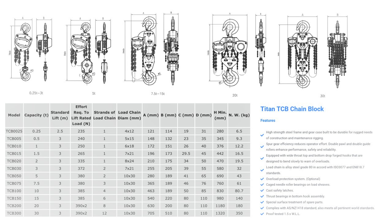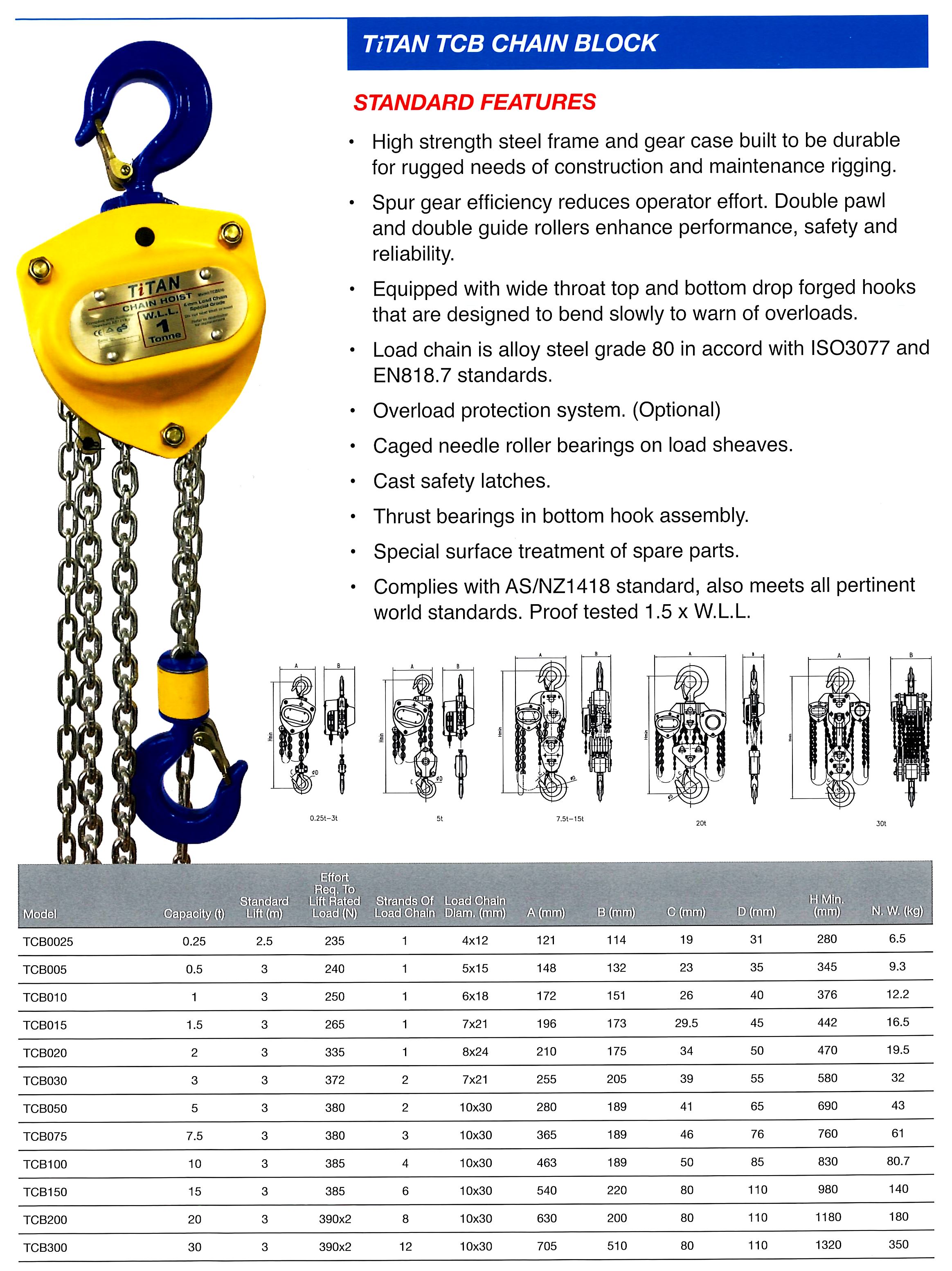 0.50T 11kg, 1.0T 13kg, 1.5T 14kg, 2.0T 23kg, 3.0T 33kg, 5.0T 48kg, 10.0T 70kg