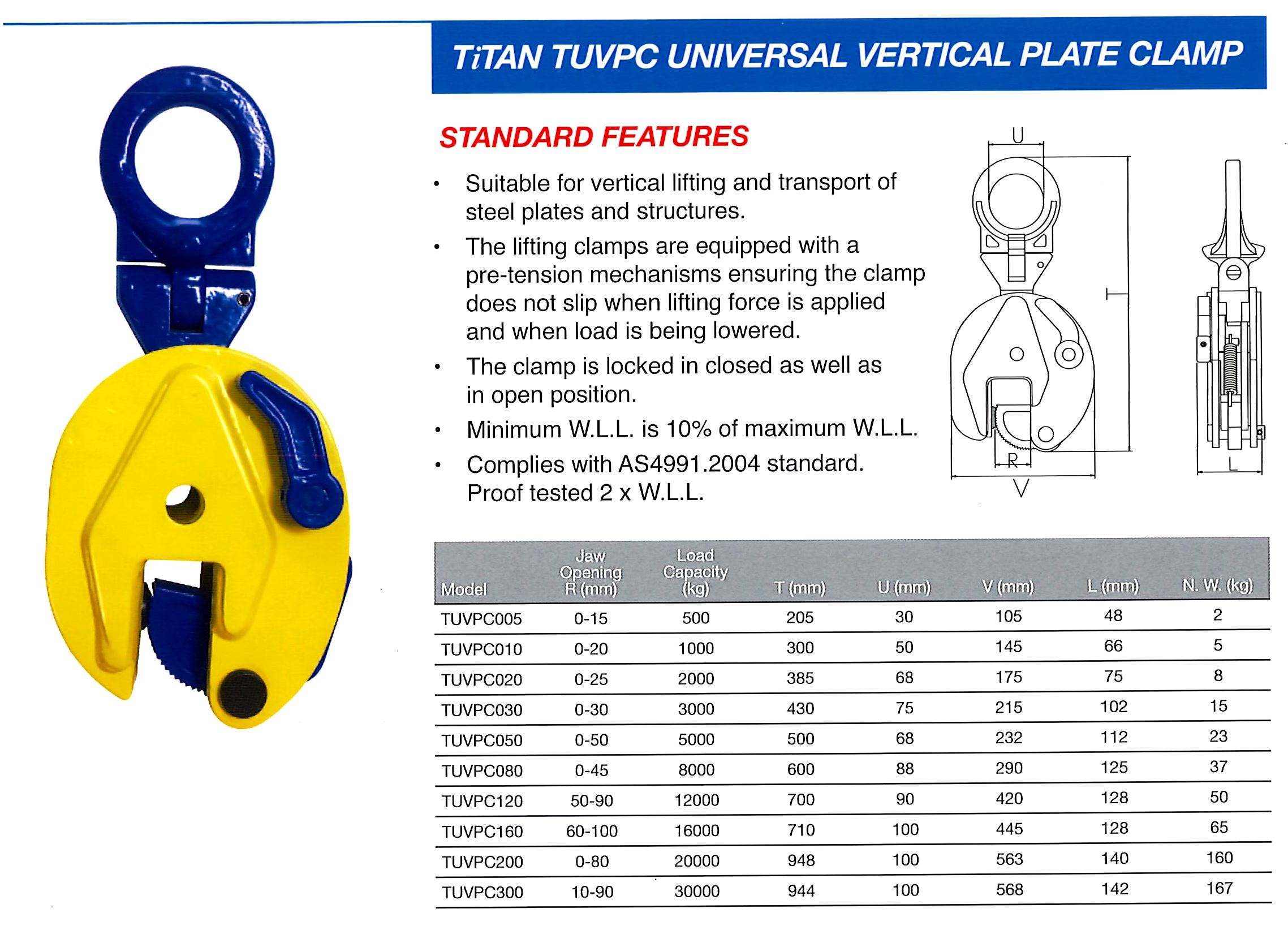 Titan Plate Clamps are manufactured to handle steel plates not exceeding 300 Brinell Hardness or 32 Rockwell.