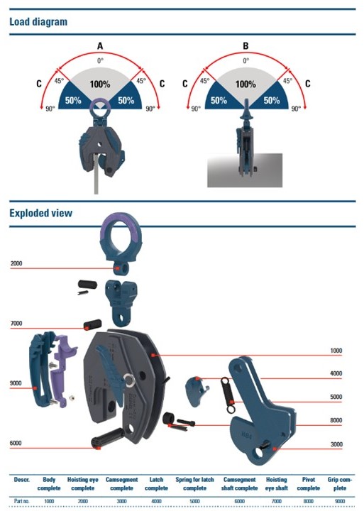 • The hinged hoisting eye allows for the clamp to place and lift the load from any direction, or with a multiple leg sling without side loading the clamp.