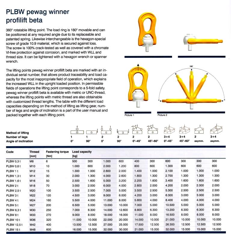 The lifting points pewag winner profilift beta are marked with an individual serial number, that allows product traceability and load capacity for the most inappropriate field of operation, which explains the increased WLL in the upright loaded position.