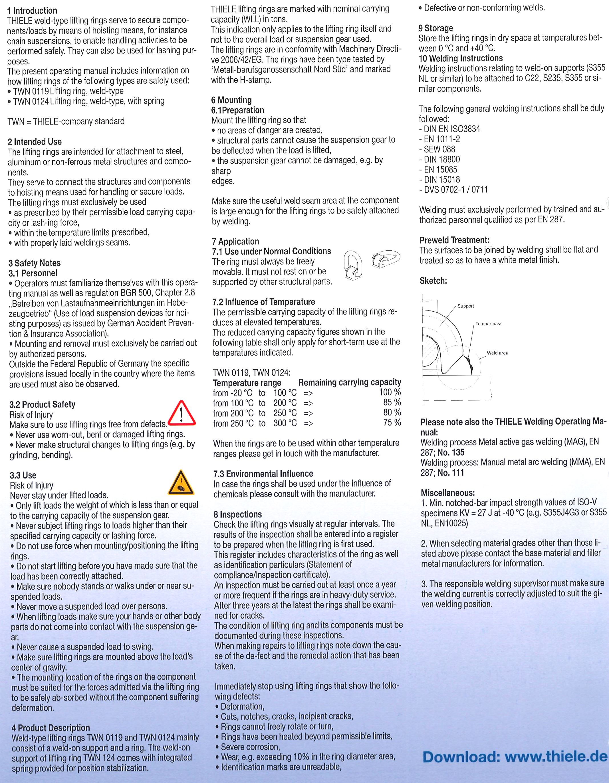 In addition to the sheet thickness, the selection of the sheet material (yield point, tensile strength) and, in particular, the specifications of the surrounding construction (e.g. distances to further reinforcements and their properties) have a significant influence on the strength and rigidity of the overall system. Since there is an infinite variety of installation and variation options for the welding points, we as the manufacturer of the attachment and lashing points cannot make any specific specifications. It therefore remains the responsibility of the manufacturer of the welding point to determine its structural features in such a way that the requirements outlined in the mounting instructions are met.